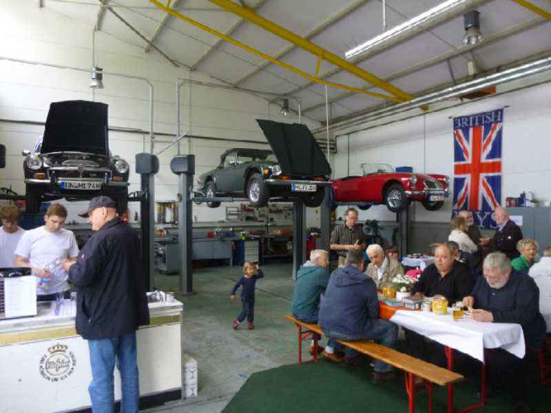 Wie sagt man so schön, das Glück ist mit den Tüchtigen. So gesehen müssen Elke und Martin Neubauer dann wohl zu den ganz Tüchtigen gehören, denn pünktlich zum Werkstattfest der Firma Neubauer und Weide in Schwerte-Villigst bescherte uns das Wetter den ersten wirklich schönen Tag im Mai. Der MG Drivers Club war natürlich auch wieder mit einem Clubstand vertreten, an dem sich viele Besucher über den Club und seine Aktivitäten informierten oder aber Kleinigkeiten aus dem Regaliaprogramm erwerben konnten. Beim Car Boot Sale, der seit einigen Jahren im Rahmen dieser Veranstaltung stattfindet, konnte man in alten Teilen stöbern oder aber bei unserem Clubmitglied Detlev Rosenkranz MG Modelle in allen Maßstäben erwerben. Fazit: Es war mal wieder ein gelungenes Event, das für viele anscheinend inzwischen zum Pflichtprogramm gehört, denn es werden Jahr für Jahr mehr Besucher.