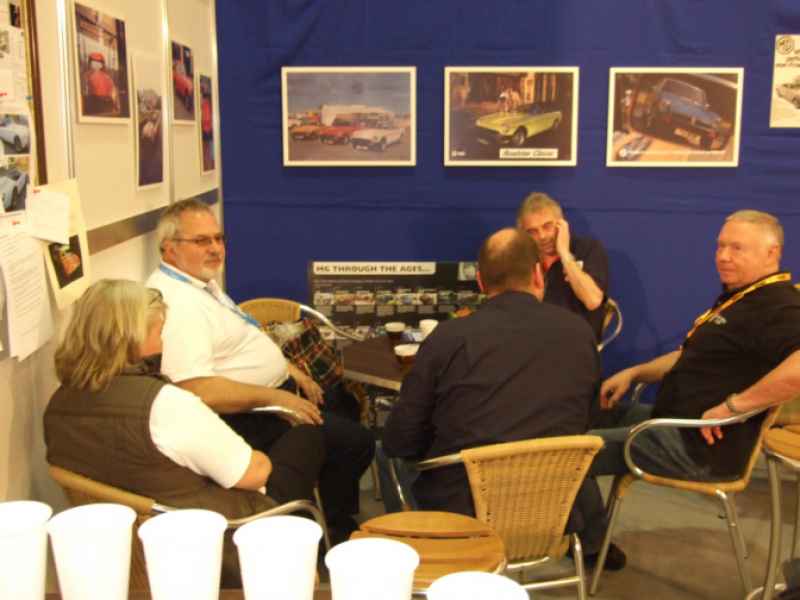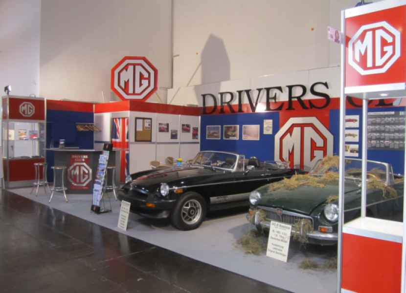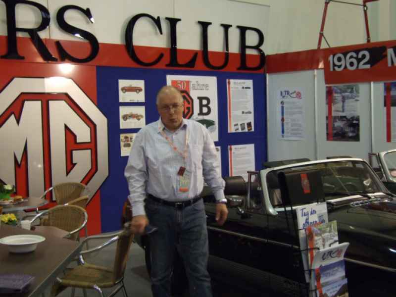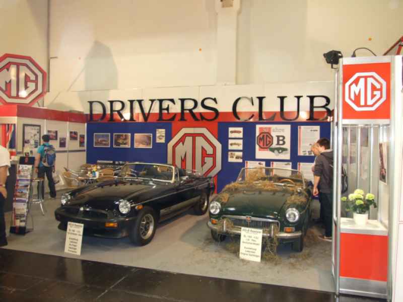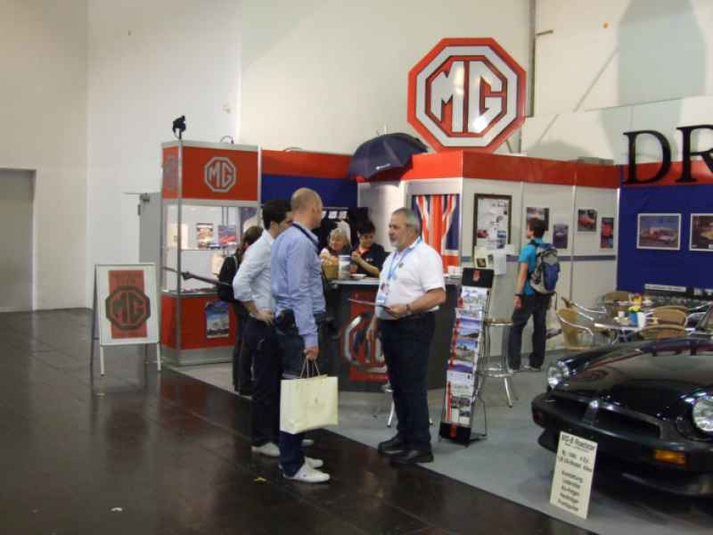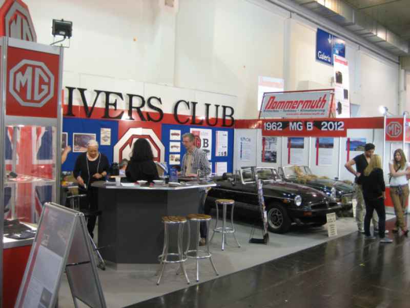 Das diesjährige Motto des MGDC- Clubstandes stand ja eigentlich nicht zur Diskussion, wurde doch der MGB vor 50 Jahren erstmalig der Öffentlichkeit vorgestellt. Ein frühes "Pullhandle" Modell und ein später "Limited Edition" mit Gummi Stoßstangen, jeweils in unterschiedlichem Erhaltungszustand, zeigten die Veränderung des MGB in den rund 18 Jahren seiner Produktion dann auch auf dem Stand in Halle 2.