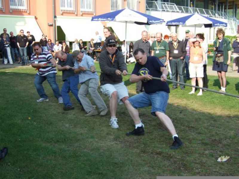 Die Wahl der Clanchiefs stand auf der Tagesordnung. Der Abend klang bei gutem Essen und lecker Bier oder Whisky feuchtfröhlich aus. Am Samstag wurden die 3 Clans auf eine Rundfahrt von ca 145 Km durch die Eifel geschickt. Der Morgan Clan hat eine sehr schöne Strecke über kleine Straßen und durch sehenswerte Landschaften für uns ausgewählt. Ein Kompliment an die Planer. Bei strahlendem Sonnenschein war diese Rundfahrt ein echter Genuss. Während der Ausfahrt hatten wir Fragen zu beantworten und wir konnten uns in verschiedenen Disziplinen, auch Spielchen genannt, messen. Nach der Rückkehr ins schön gelegene Jugendgästehaus wurden die Outdoor Games ausgetragen. Mit einem Sektempfang und reichaltigem Buffet wurde der Abend eingeläutet. Nachdem sich alle gestärkt hatten, standen die Indoor-Games auf dem Programm. Alle Clans gaben wie immer „Ihr Bestes“ – denn es kann nur EINEN geben.
