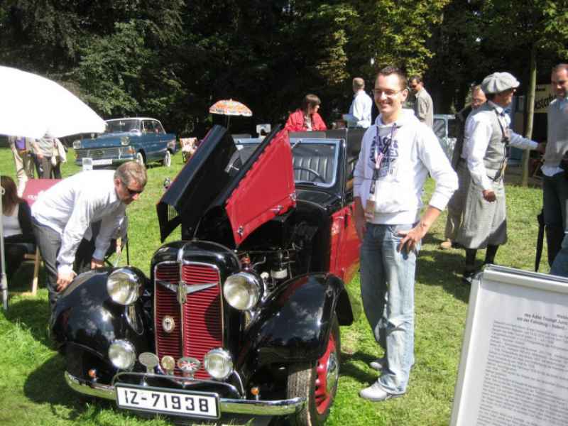 Glücklicherweise hat dieser Hintergrund dem aktuellen Renn-Enthusiasmus keinen Abbruch getan und alle ( 28 T ), alle kamen, staunten, genossen und freuten sich schon aufs nächste Mal. So erfüllte das erlesene Programm im malerischen Ambiente wieder mal elegant und frisch, zeitweise etwas hemdsärmelig, die hoch gesteckten Erwartungen. Nur das liebe Wetter spielte am Samstag verrückt und spendete in den Nachmittagstunden reichlich Wasser. Auf dem Claim der Erinnerungen und gelebten Träume darf auch ein traditionsbeladener Markenclub, wie unser MG Drivers Club nicht fehlen. Sein leuchtend blaues Zelt bildete in bester Lage der Schloßallee im Miscanthusfeld den Auftakt und Wegweiser einer 3er MG-Club-Scene aus MGDC, MGCC, SPRIDGETS, mit etlichen Clubfahrzeugen der roten Reihe bestückt. Die anschließenden Alleen des Miscanthusfeldes füllten sich in diesen zwei Tagen zum Oldtimergroßereignis mit ca. 6T Fahrzeugen der Gäste und Fans. Unser bewährtes Standteam empfing eintrudelnde Gäste gleich freundlich und bot Speis und Trank in geselliger Runde. Klaus, der aus der letztjährigen Aufführung bekannte Spezial Kaffee Kocher, war auch dieses Jahr wieder in seinem Element und sprang einem B Roadster Neuerwerber elastisch, Rat und Tat proklamierend, unter die Karosse, um etwaige Inkontinenzen (Öl) für ihn zu ertasten. Auch unser nimmermüdes Siegerlandgespann um Else und Hartmut verwöhnte mit ihrer Anwesenheit und verbreitete gute Laune. Wie kulinarisch ausgefeilt es dort auch gewesen sein mag, so wirkte dieses Jahr besonders jenes Aphrosidiakum : Sound / Sound / Sound, von den üblich verdächtigen Boliden auf der pulsierenden 2,8 KM Renn Ader und ließ Keinen allzu lange am Stand verweilen. Diese vibrierende Physik, entfesselter OTTONIK musste einfach hautnah miterlebt werden, wenn grollende 12er Formationen Bentleys oder wild entfesselte Reisschüsseln der klassischen Rallyescene im Verband mit einem fauchenden, knallgelben Steinmetz Rekord den Asphalt um die Wette verbrannten. Einen besonderen Augen- und Ohrenschmaus bildete Hans Herrmann (81) im 300 SLR von Juan Mannuel Fangio aus 1955, den er dermaßen ambitioniert / sicher und Uhrwerk gleich mit seinem sanften Lächeln auf den Lippen über die Strecke pilotierte, dass unser Genießen endlos wirkte. Auch der Schlossparkbereich war, wie gewohnt bestens bestückt und für nicht am Rennbetrieb Interessierte eine gute Alternative, zu schauen und unter der Sonne zu verweilen. Dort erweckte ein 1938er Adler Trumpf Junior im perfekten Trimm die Aufmerksamkeit der Flanierenden, konnten sie sich doch, bei geöffneter Haube, am seidenweichen, schüttelfreien, stoischen Dauer-Rund-Lauf seines frischen 30PS Vierzylinders erfreuen. Bei dieser Performance fragt man sich gelegentlich, worin eigentlich der Fortschritt bestehen soll ?