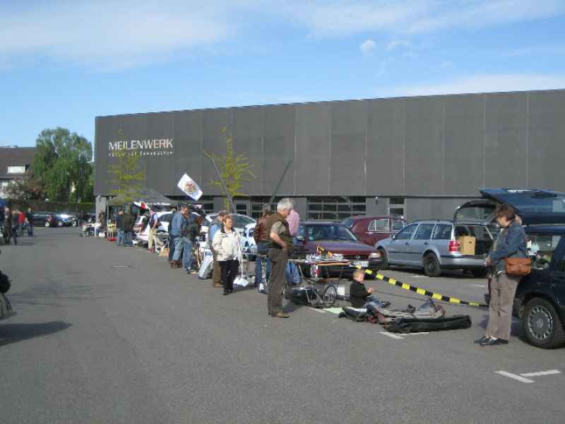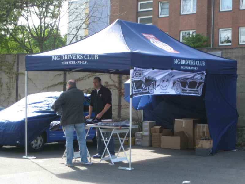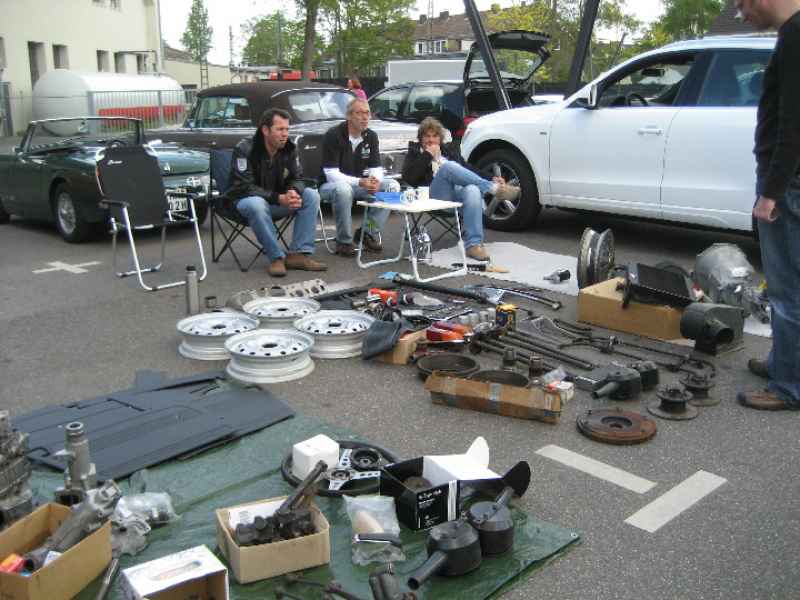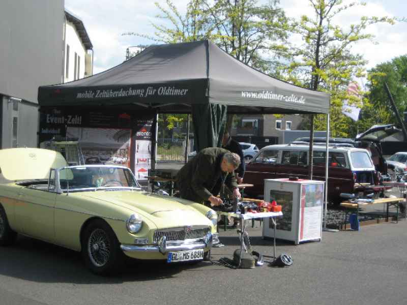 Da haben wir mal wieder reichlich Glück gehabt. Noch am Mittwoch sah die Wettervorhersage für den Samstag nur Regen vor. Etwas Hoffnung gab es am Freitag Abend und der Samstag selbst bot herrliches Ausflugswetter. So kamen dann auch ab 9 Uhr früh gut 20 angemeldete Verkäufer, die Ihren Car-Boot entleerten und es sich hinter oder zwischen ihren Ersatzteilen auf dem hinteren Parkplatz des Meilenwerks in Düsseldorf bequem machten. Marcus Pieper baute seinen Regaliastand im Eingangsbereich auf und unter Ulrich Hungers Begrüßungszelt spielte, zum Szenario passend, eine Rock-Ola Regis Baujahr 1961 Schallplattenwünsche aus den 50ern und frühen 60ern ab. Von der Atmosphäre waren alle begeistert. Traf man doch eine Reihe neuer und alter Bekannter, die entweder ebenfalls zum Verkaufen oder aber zum Stöbern gekommen waren. Viel Betrieb herrschte aufgrund des schönen Feiertagswetters und auch einige Meilenwerkbesucher fanden den Weg zum Car Boot Sale. Mit den Verkäufen ging es allerdings eher schleppend, so dass der Samstag eher unter dem Motto „Nettes MGDC Event mit netten Leuten“ als unter dem Umsatzaspekt verbucht werden konnte, was viele allerdings auch nicht anders erwartet hatten. Bleibt zu überlegen, wie wir im kommenden Jahr den MG Car-Boot-Sale im Vorfeld in der Szene noch besser bewerben, um mit der Zeit auch den Kauf- und Verkaufsaspekt ein wenig zu stärken.