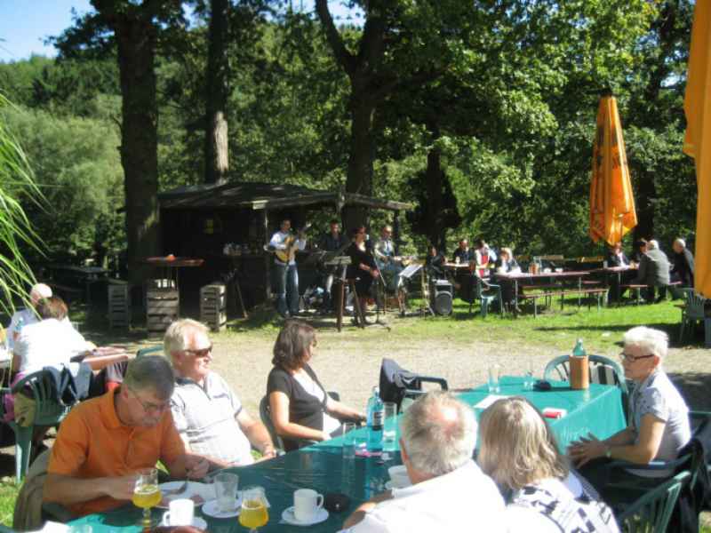 Dort erwartete sie herrliches Biergartenwetter, reichlich Buffet und wie immer Livemusik. Lulu’s Salonkapelle begeisterte mit alten und ganz alten Schlagern, Oldies, Zigeunermusik und der einen oder andere Ballade. Zwar war die Runde diesmal ein wenig kleiner als in den letzten Jahren, doch das tat der guten Stimmung keinen Abbruch. Bis 16 Uhr verweilten die letzten Teilnehmer, die teilweise eine Anreise von über 100 Kilometern in Kauf genommen hatten. Bis zum nächsten Jahr beim MG Brunch & Blues des MG Drivers Clubs Deutschland e.V. in Dortmund-Syburg.