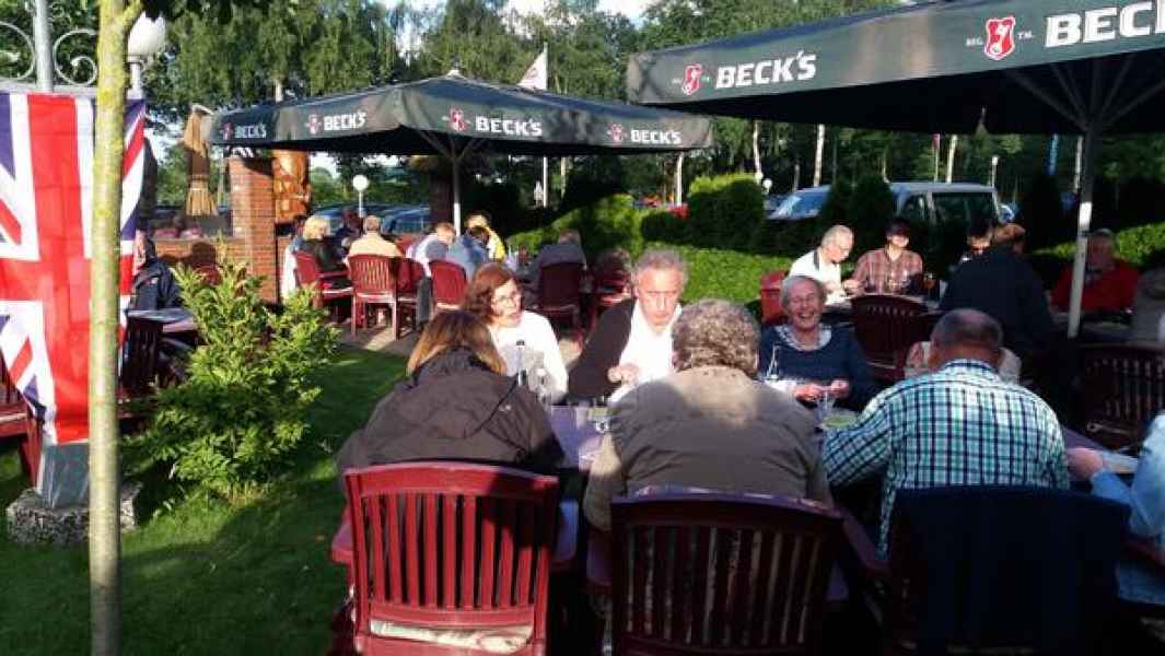 Begrüßung der 30 Teams gegen 19.00 Uhr im Biergarten des Hotel Ripken durch Werner mit seinem bewährten Team, fröhlicher Auftakt bei angemessenem Wetter.