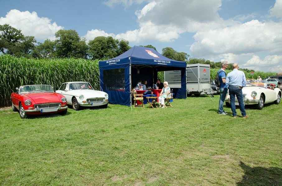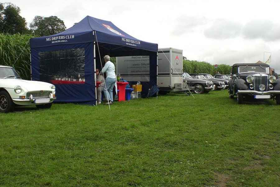 Der einzige gravierende Unterschied zu den Veranstaltungen der Vorjahre war am Samstag der bis zum Mittag andauernde Regen. Wer nun meint dass sich die MG Fahrer wegen des Wetters vom Besuch des Clubzeltes abhalten ließen, der sah sich getäuscht. Die Reihen der parkenden MGs waren alsbald gut gefüllt und ebenso das Zelt! Die mitgebrachten Picknicks wurden auf die Tische verteilt und die Stimmung war bestens.