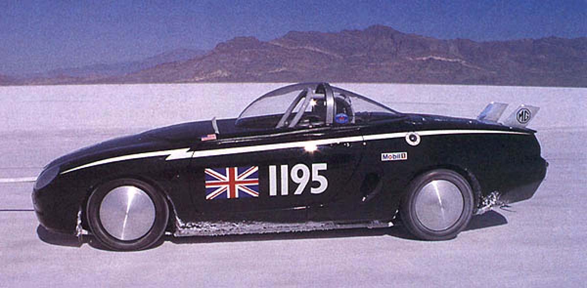 Nach Art von EX 181 für Weltrekordfahrten auf den Bonneville Salt Flats präparierter MGF. Turbogeladener 1,4 Liter-Motor mit 333 PS.