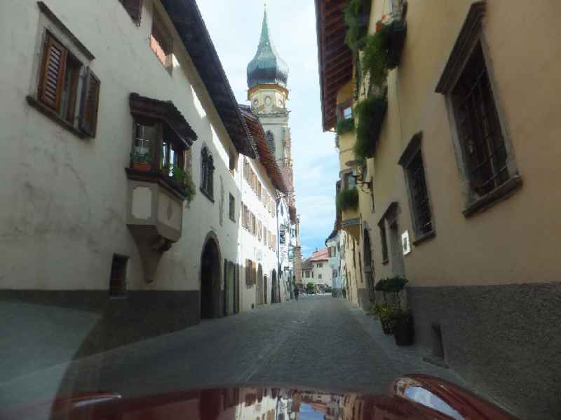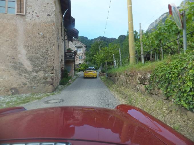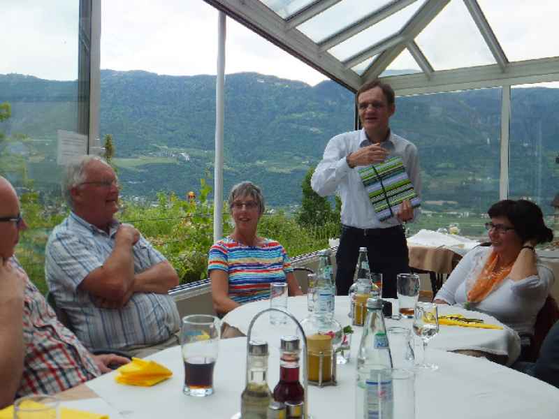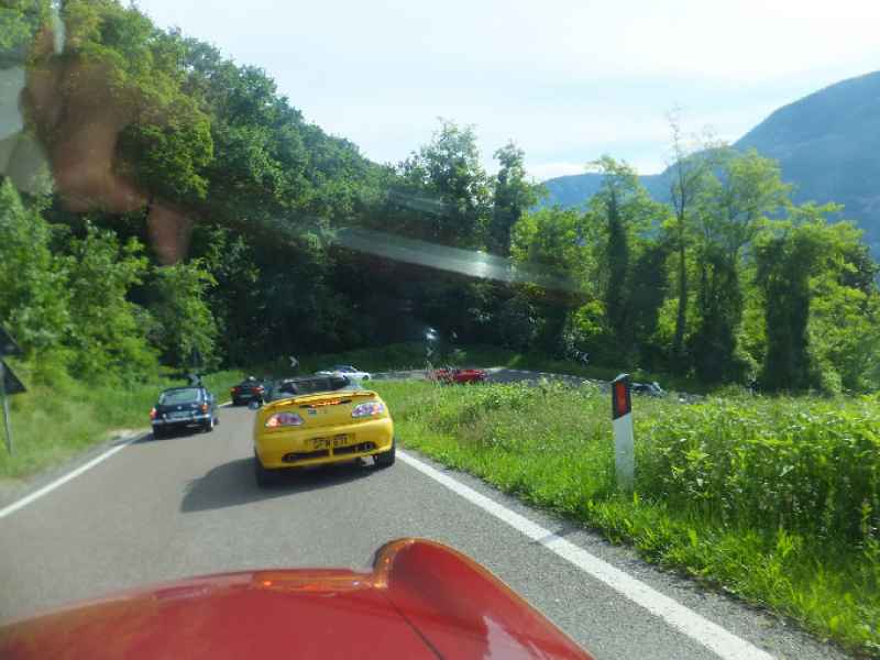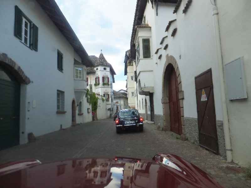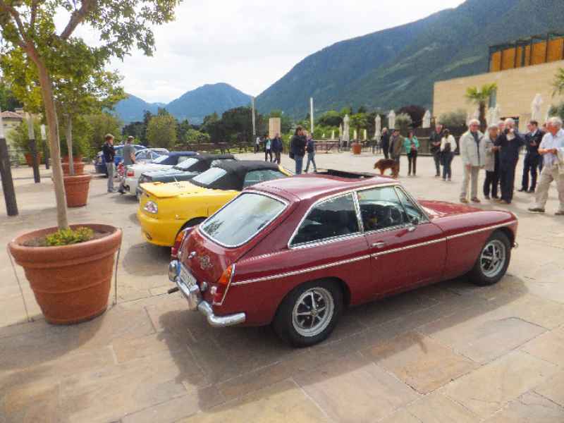 Am nächsten Morgen ging es durch enge Bahnen in den Weinbergen zum Schloss Trautmannsdorf bei Meran. Dies ist eine märchenhafte Gartenanlage, die man bei Kaiserwetter einen ganzen Tag lang durchstreifen kann, ohne aus der Begeisterung zu rutschen. Keinen Moment lang ist es ob der verwirklichten Ideenvielfalt gleich anzusehen. Von hier aus führte uns der Weg zur Mittagsrast beim Traubenwirt in Marling mit Übergabe eines Präsentes für die weiteste Anreise, die Gary & Pamela aus Silverstone (gelber MG TF) erhielten. Nach ausgiebiger Stadtbesichtigung von Meran endete unser Tag kulinarisch gemütlich in der Pizzeria Wiesenheim.