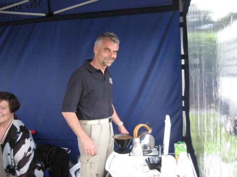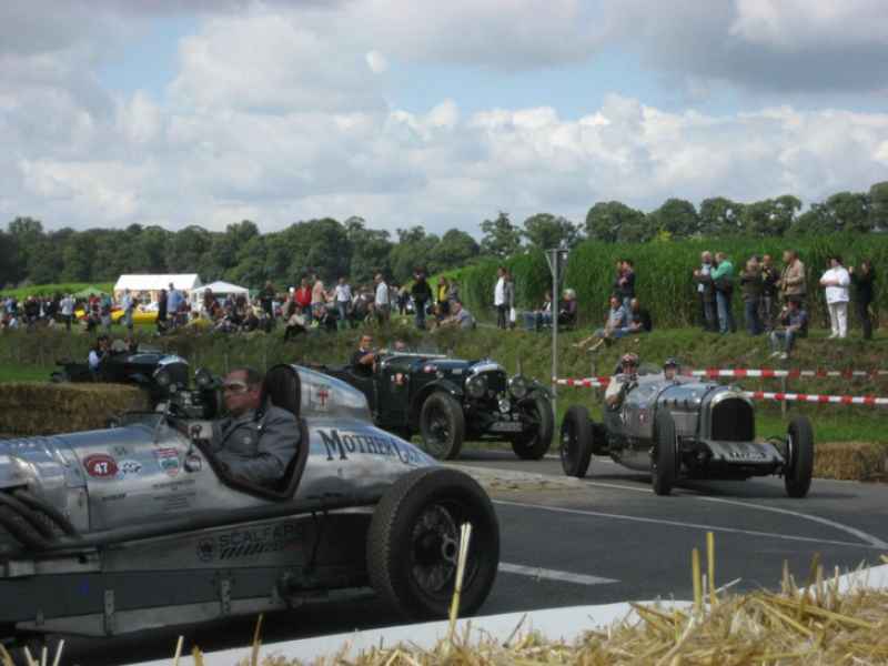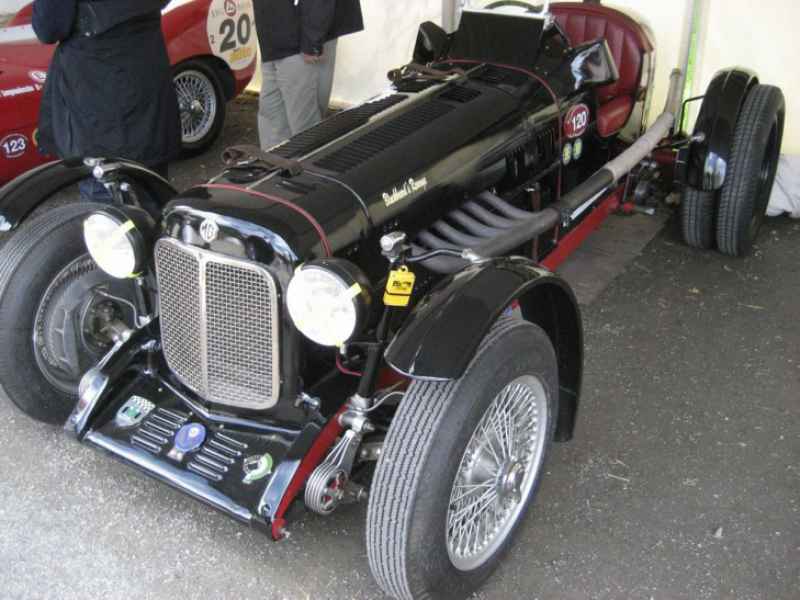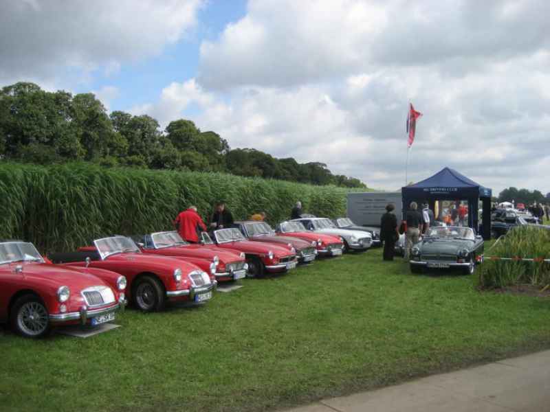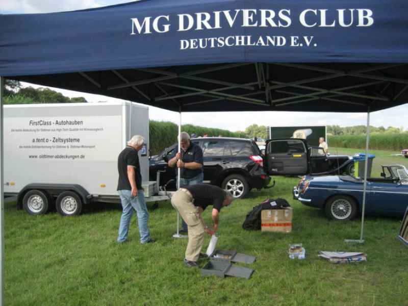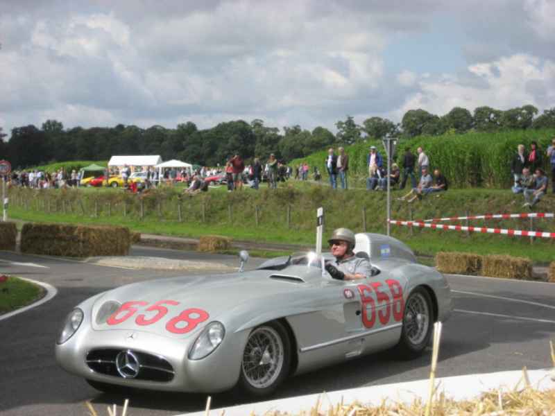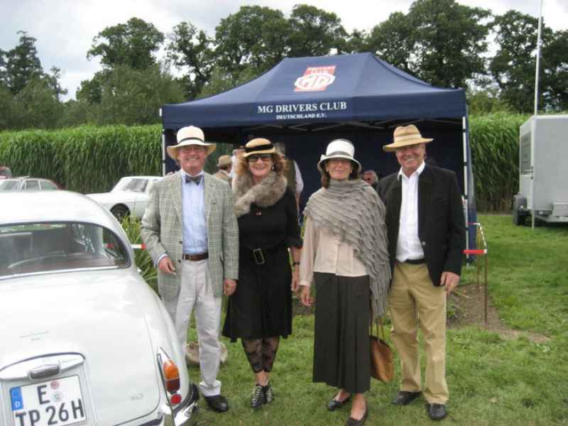 Glücklicherweise hat dieser Hintergrund dem aktuellen Renn-Enthusiasmus keinen Abbruch getan und alle ( 28 T ), alle kamen, staunten, genossen und freuten sich schon aufs nächste Mal. So erfüllte das erlesene Programm im malerischen Ambiente wieder mal elegant und frisch, zeitweise etwas hemdsärmelig, die hoch gesteckten Erwartungen. Nur das liebe Wetter spielte am Samstag verrückt und spendete in den Nachmittagstunden reichlich Wasser. Auf dem Claim der Erinnerungen und gelebten Träume darf auch ein traditionsbeladener Markenclub, wie unser MG Drivers Club nicht fehlen. Sein leuchtend blaues Zelt bildete in bester Lage der Schloßallee im Miscanthusfeld den Auftakt und Wegweiser einer 3er MG-Club-Scene aus MGDC, MGCC, SPRIDGETS, mit etlichen Clubfahrzeugen der roten Reihe bestückt. Die anschließenden Alleen des Miscanthusfeldes füllten sich in diesen zwei Tagen zum Oldtimergroßereignis mit ca. 6T Fahrzeugen der Gäste und Fans. Unser bewährtes Standteam empfing eintrudelnde Gäste gleich freundlich und bot Speis und Trank in geselliger Runde. Klaus, der aus der letztjährigen Aufführung bekannte Spezial Kaffee Kocher, war auch dieses Jahr wieder in seinem Element und sprang einem B Roadster Neuerwerber elastisch, Rat und Tat proklamierend, unter die Karosse, um etwaige Inkontinenzen (Öl) für ihn zu ertasten. Auch unser nimmermüdes Siegerlandgespann um Else und Hartmut verwöhnte mit ihrer Anwesenheit und verbreitete gute Laune. Wie kulinarisch ausgefeilt es dort auch gewesen sein mag, so wirkte dieses Jahr besonders jenes Aphrosidiakum : Sound / Sound / Sound, von den üblich verdächtigen Boliden auf der pulsierenden 2,8 KM Renn Ader und ließ Keinen allzu lange am Stand verweilen. Diese vibrierende Physik, entfesselter OTTONIK musste einfach hautnah miterlebt werden, wenn grollende 12er Formationen Bentleys oder wild entfesselte Reisschüsseln der klassischen Rallyescene im Verband mit einem fauchenden, knallgelben Steinmetz Rekord den Asphalt um die Wette verbrannten. Einen besonderen Augen- und Ohrenschmaus bildete Hans Herrmann (81) im 300 SLR von Juan Mannuel Fangio aus 1955, den er dermaßen ambitioniert / sicher und Uhrwerk gleich mit seinem sanften Lächeln auf den Lippen über die Strecke pilotierte, dass unser Genießen endlos wirkte. Auch der Schlossparkbereich war, wie gewohnt bestens bestückt und für nicht am Rennbetrieb Interessierte eine gute Alternative, zu schauen und unter der Sonne zu verweilen. Dort erweckte ein 1938er Adler Trumpf Junior im perfekten Trimm die Aufmerksamkeit der Flanierenden, konnten sie sich doch, bei geöffneter Haube, am seidenweichen, schüttelfreien, stoischen Dauer-Rund-Lauf seines frischen 30PS Vierzylinders erfreuen. Bei dieser Performance fragt man sich gelegentlich, worin eigentlich der Fortschritt bestehen soll ?