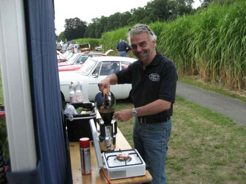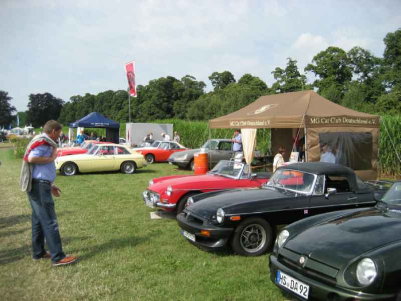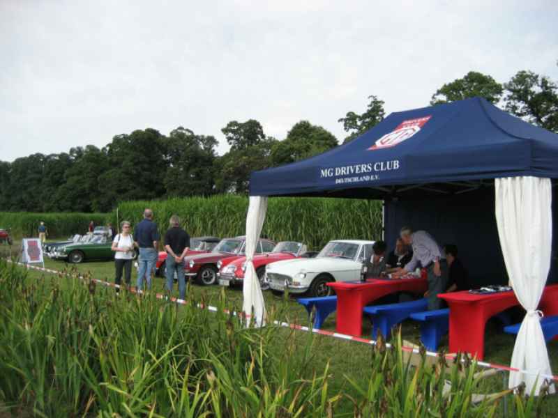 Das herrlich königsblaue MG Drivers Clubzelt in der Schlossallee des Miscanthusfeldes bildete in Reihe mit dem kaffeebraunen Stand des MG Car Club eine optische Einheit, die durch die in der Sonne funkelnde Aufstellung der Clubfahrzeuge noch geschmackvoll gesteigert wurde. Das Areal des Miscanthusfeldes verwandelt sich hier an diesen zwei Tagen zum größten Freilichtautomobilmuseum mit einer Aufführung von ca. 5.000 Club- und Fanoldtimern. Unser freundliches Team um Ulrich Hunger und das Siegerlandduo Else & Hartmut Franke versorgte die eintrudelnden Mitglieder liebevoll in Wort und Tat (sprich Labung) während sich Klaus Ullrich charmant als unermüdlicher Kaffeebrüher erwies.