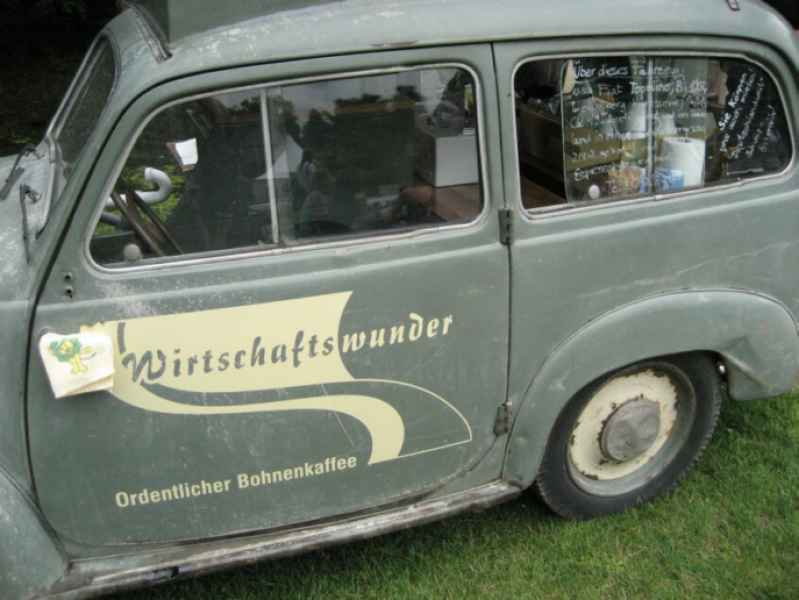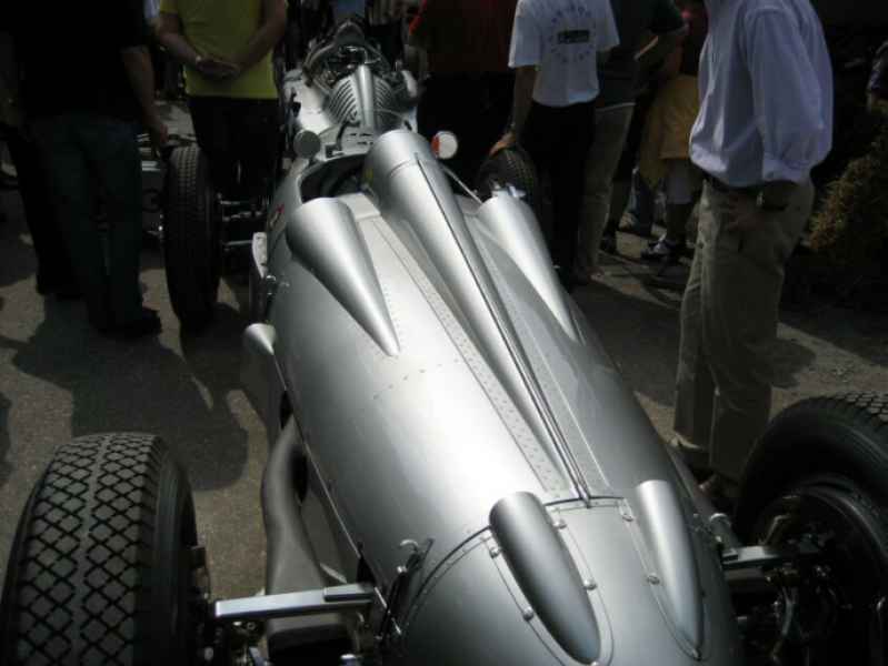 Am Nachbarstand gab sich der 2. Vorsitzende, Herr Hess als aktiver Teilnehmer mit seinem Lagonda die Ehre. Doch auch das tollste Standteam konnte einen hier nicht lange binden, wenn hinter der Schilfwand der verführerischste Motorensound von Legenden der Rennstrecke herüberschallt und das berühmte Gen erwacht, dann muss man dahin. Hier schossen quasi zum Greifen (Fotografieren) nah, die Boliden unserer kühnsten Phantasien vorbei, wie Mercedes SSK mit infernalischem Kompressorpfeifen, oder eine dunkle Gruppe Bentley Blower, Auto Union 12 Zylinder von der Avus 1934 und last but not least Neuzeitlegenden wie Walter Röhrl im Kurz-Quattro. Dazu gesellte sich im Schlossparkbereich jede Menge Wohlfühlaroma mit Concours d´Elegance oder original 50er Jahre Feeling mit Kleinstwagen, Miniwohnwagen und einem „unverbastelten“ Fiat Topolino Kombi als Kaffeestation. Dieses Wochenende ist und bleibt, wie es auch Jochen Maas im Namen der Mercedes Oldtimer Abteilung übers Rennsprecher Mikro postulierte, ein echtes Highlight, das die einmalige Goodwood Atmosphäre nach Deutschland zaubert und das man keinesfalls verpassen sollte, um seine Wohlfühlbatterie fürs weitere Oldtimerjahr schon mal gut vor zu heizen.