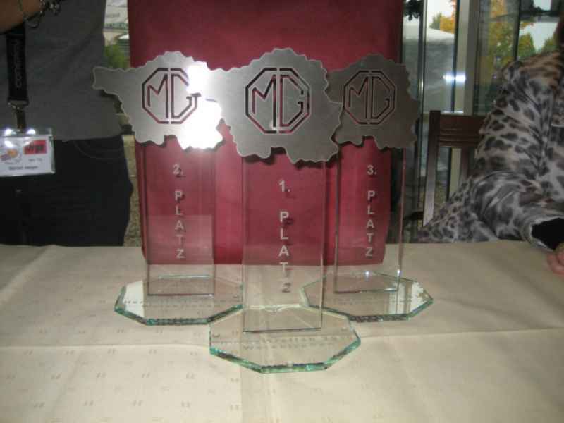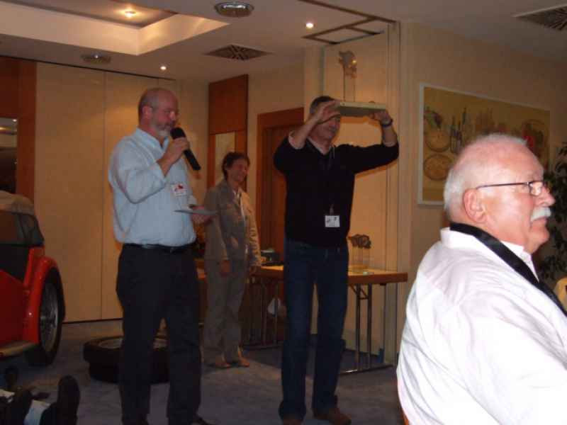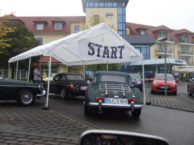Am Samstagmorgen hatte der Wettergott kein Einsehen und hat uns typisches, englisches Wetter beschert. Es nieselte und Nebel ala Edgar Wallace begleitete uns fast die ganze Ausfahrt. Um 10.30 Uhr wurde im Minutentakt bei absolutem Schmuddelwetter gestartet. Das Roadbook war für alle Teilnehmer verständlich ausgearbeitet. Die Strecke führte uns durchs Saarland, Luxemburg und Frankreich und war unterwegs mit einigen Aufgaben und Prüfungen gespickt. Gegen 19.00 Uhr traf dann auch das letzte Team ohne Panne am Zielort ein. Nachdem reichhaltigen und sehr schmackhaften Gala-Buffet warteten die Teams schon gespannt auf die Siegerehrung. Die einzelnen Prüfungen und Aufgaben waren in diesem Jahr so spannend und spaßig zugleich, so dass es schwer war, einen der wunderschönen Pokale zu gewinnen. Die Pokale für die Plätze 1 bis 3 wurden auf die CH, D und F aufgeteilt. Weitere Sachpreise bis Platz 10 erhielten ebenfalls Teams aus dem Ausland. Manfred Jaeger und sein Team haben sich als sehr gute Gastgeber präsentiert. Der Abend klang sehr gesellig und gemütlich weit nach Mitternacht aus. Am Sonntag schien die Sonne und machte das englische Wetter vom Vortag wieder wett. Horst Meyer aus dem Orga-Team hatte für uns eine, wie wir hinterher feststellten, traumhafte Strecke vorbereitet. Diese wurde mit allen Teams im bekannten „Wegweiser System“ gefahren und allen stand die gute Laune ins Gesicht geschrieben. In Herrstein wurden wir mit einem Sektempfang begrüßt, was allen sichtlich gefiel. Ein paar Teilnehmer nutzten die 30 minütige Pause um sich das historische Städtchen anzusehen. Danach ging es über kleine Straßen weiter zur Mittagsrast nach Winterbach. Nach dem Mittagessen verabschiedeten sich die Teilnehmer. Die Teams waren sich einig, dass dieses Treffen ein wirkliches Highlight in der Saison 2010 war.