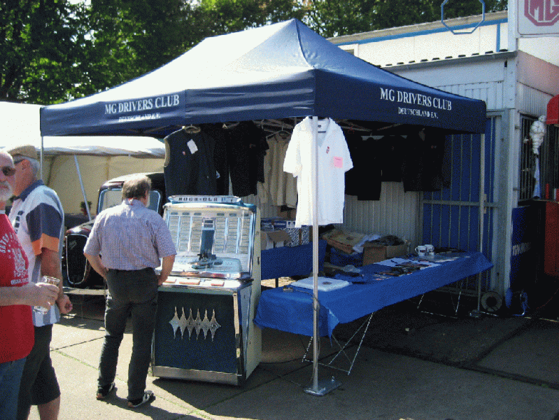 Ein kleines Dampffahrzeug drehte seine Runden, zumindest dann, wenn der Platz nicht randvoll mit Besucherfahrzeugen stand. Musik aus den 50ern und frühen 60ern kam am Stand des MG Drivers Clubs aus einer Rock Ola Regis von 1961, die sich ebenso wie die fahrbaren Raritäten als Zuschauermagnet erwies.