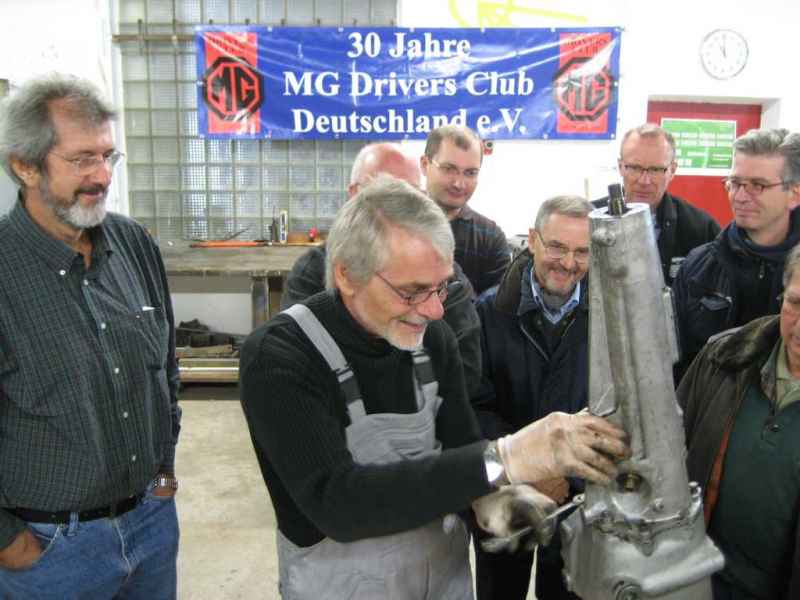 Uli Hilgenfeld als Moderator erläuterte die einzelnen Schritte beim Zerlegen eines MGA Getriebes und wies auf die Schwachstellen hin. Insbesondere sind hier die Vorgelegewelle, deren Lager und die Synchronringe zu nennen. Der Zusammenbau des Getriebes am Nachmittag wurde von engagierten Teilnehmern durchgeführt. Anschließend beschäftigte man sich noch mit für den Laien möglichen Wartungsarbeiten am Overdrive. Für das leibliche Wohl hatte Familie Schattner gesorgt, so dass die Teilnehmer nach Frühstück, Mittagessen und Kaffee mit Kuchen am späten Nachmittag satt und gut informiert heim fuhren.