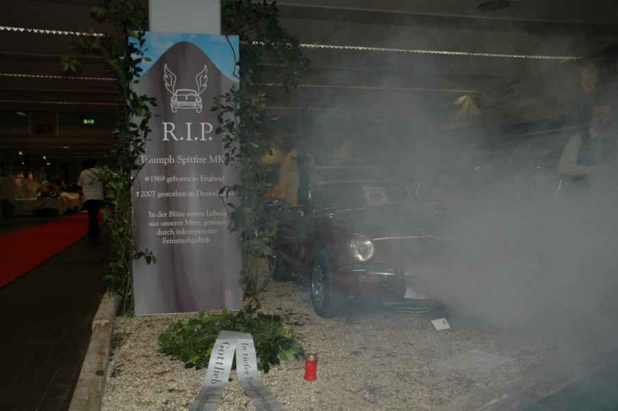Doch dieses Mal standen nicht nur die Fahrzeuge im Mittelpunkt. Vielmehr ging es auch um das Fahren selbst, denn die vier ausstellenden Clubs hatten es sich nämlich zum  Ziel gemacht, die Besucher auf die doch sehr prekäre Situation der Oldtimerszene in Zeiten drohender Feinstaub-Fahrverbote hinzuweisen. Zu diesem Zweck war unter anderem rings um einen erst kürzlich fertig restaurierten Triumph Spitfire ein Friedhofsszenario aufgebaut worden, das seine Wirksamkeit nicht verfehlte, was sich am Ende der Messe auch an der an unserem Stand ausliegenden Unterschriftenliste gegen Fahrverbote der Initiative "Kulturgut Mobilität" zeigte, in die sich bis Messeende ein Vielfaches mehr an Besuchern eingetragen hatten, als in die, die am Stand der Initiative selbst auslag. Zu diesem schönen Erfolg mag auch eine vom MG Drivers Club initiierte Protestaktion beigetragen haben, der sich auch andere Clubs und Aussteller anschlossen. Am letzten Ausstellungstag um fünf vor zwölf deckten wir unsere ausgestellten Fahrzeuge mit Bettlaken ab, um auf diese Weise zu zeigen, was künftig noch von unseren Fahrzeugen in der Öffentlichkeit zu sehen ist, wenn die angkündigten Fahrverbote Realität werden. Hoffen wir,dass uns das erspart bleibt und das auf der Techno Classica einige Clubs mehr unserem Beispiel folgen. Denn wenn auch einzelne Städte, wie während der Retro Classics auch Stuttgart, Ausnahmegenehmigungen für Fahrzeuge mit H-Kennzeichen ankündigen, die zumindest im Falle von Stuttgart auch sehr vage und unspezifisch sind, ist die Gefahr von großflächigen Fahrverboten erst dann vom Tisch, wenn es eine bundeseinheitliche Regelung pro Oldtimer gibt. Und die gibt es nur, wenn auf Messen wie der Retro Classics oder der Techno Classica nicht nur die schöne, heile Welt der Oldtimerei dargestellt wird, sondern auch deren Bedrohung durch voreilige und unbegründete Fahrverbote thematisiert wird.