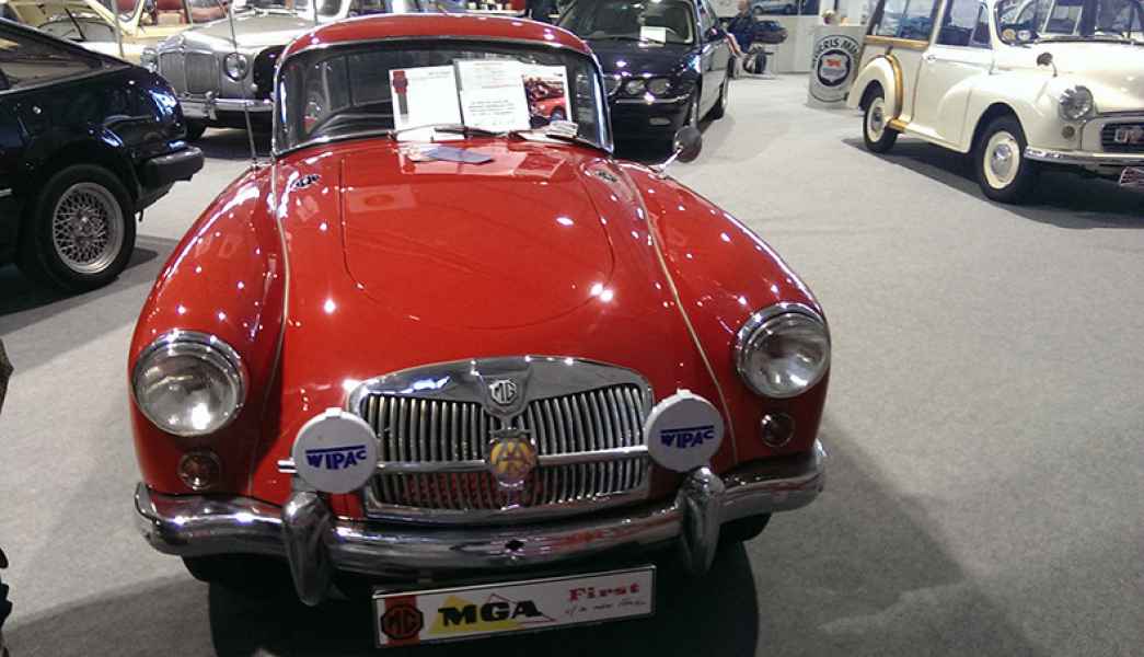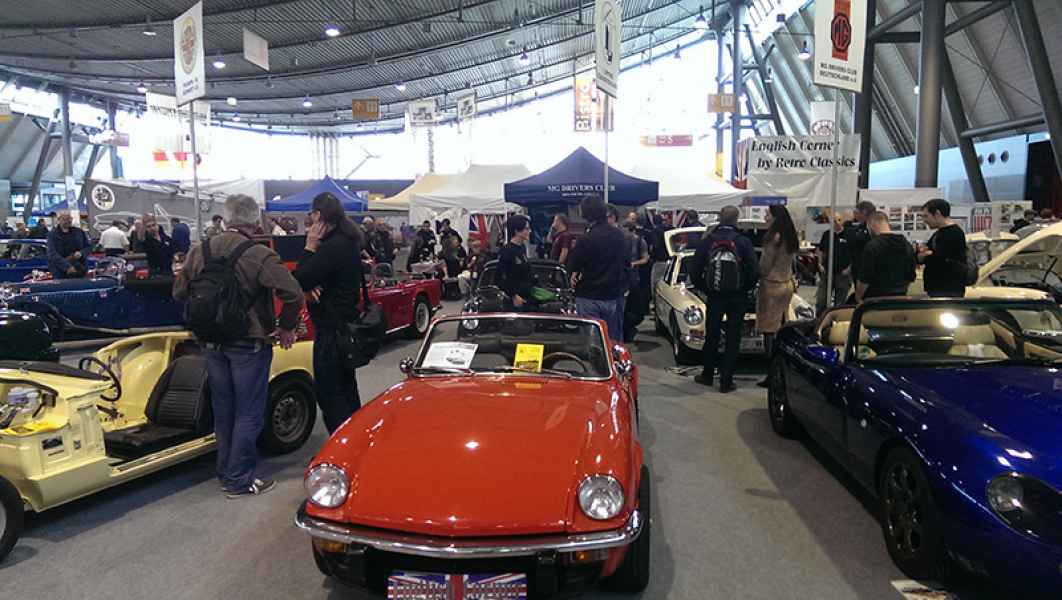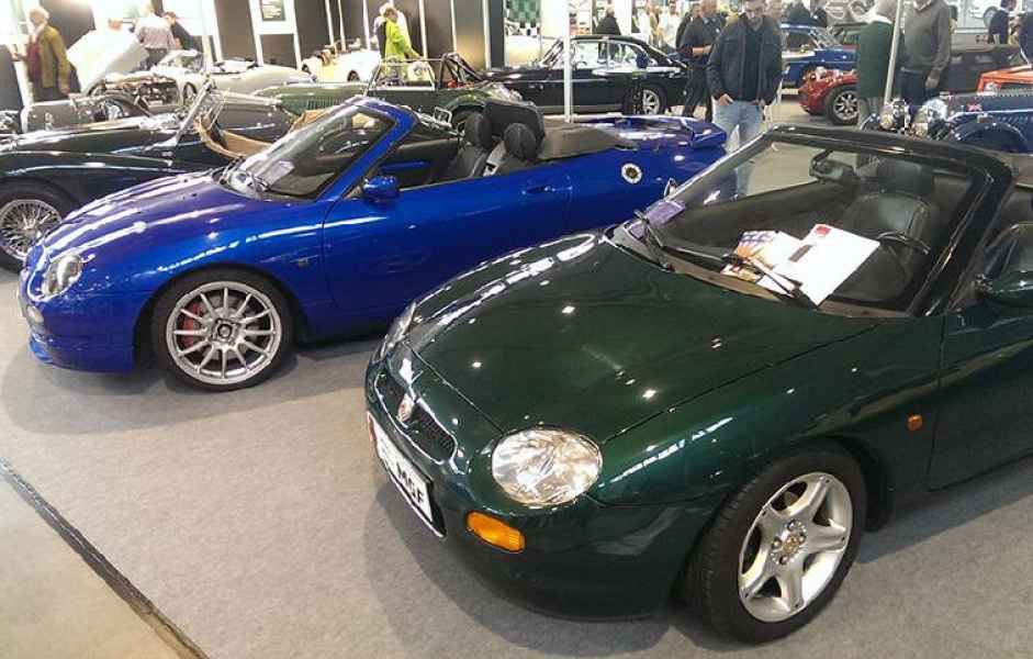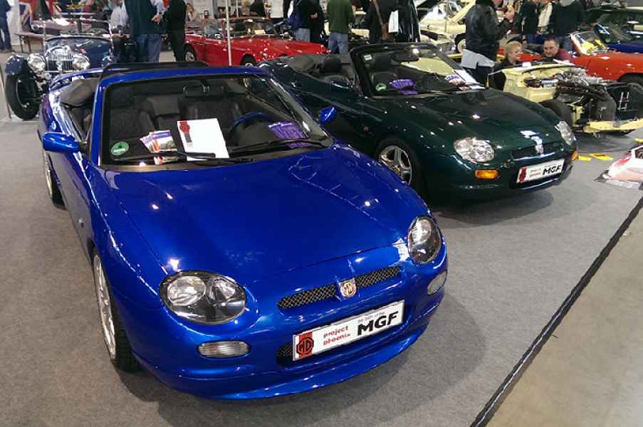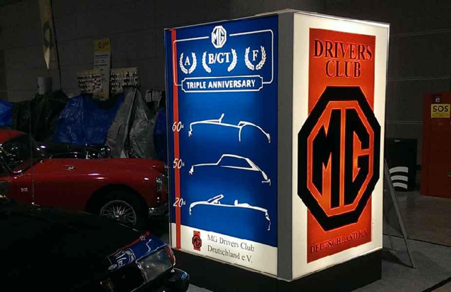 Zum ersten Mal – In 2014 konnten wir es noch vermeiden – hatten wir unseren Stand komplett mit Teppich ausgelegt. Insgesamt 620 Quadratmeter Standfläche hatte der „English Corner“ den wir uns wie in den vergangenen Jahren wieder mit unseren Freunden vom Spitfire Club Deutschland, der TR IG Südwest, der Morris Minor IG, dem Triumph Stag Club, dem Morgan Club und den Rover Freunden teilten. Auf diese Art konnten wir auch dieses Jahr wieder einen schönen Überblick über die englische Automobiltechnik bieten, wobei wir MG Freunde gleich drei Jubiläen zu feiern hatten: 60 Jahre MGA, 50 Jahre MGB GT und , man glaubt es kaum, 20 Jahre MGF. Professionell von Andreas Herrmann entworfen warben große Leuchtbanner für diese Ereignisse und zogen etliche Clubmitglieder an, die sich an unserem Stand bei Essen, Trinken und Fachgesprächen von den Strapazen der Messe erholten.