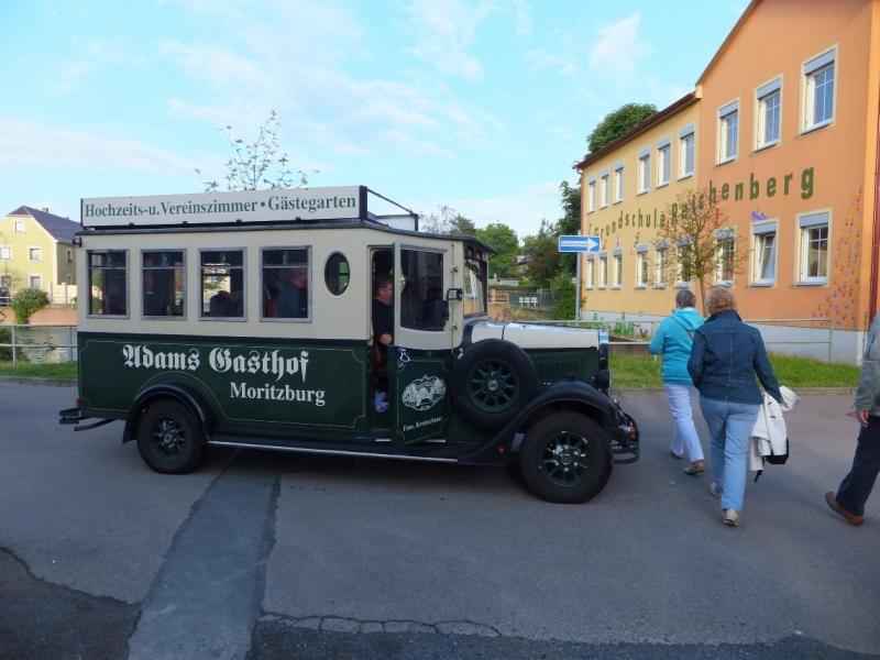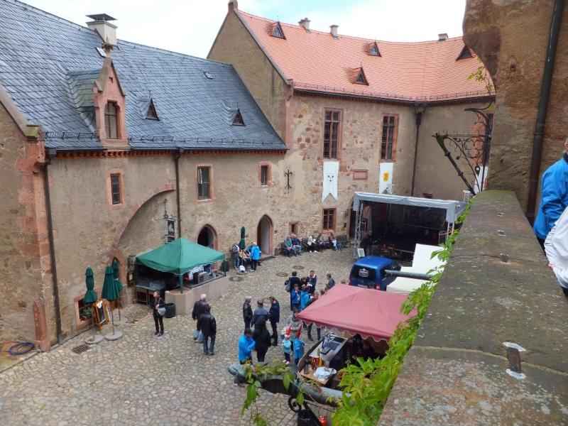 Samstags startete der 5. Punkt, ab 8:30, mit Peters Fleißpäcken & kniffligem Roadbook inklusive zweier Fahr-Prüfungen. Hier gab es auch 3 Wertungspokale direkt vor Ort. Der Endpunkt lag bei einer verwunschenen Feste im Stile von Kindheitsträumen im echten Steilhang, wo man sich zufällig gleichzeitig zum Vorkriegsmotorradtreff traf. Toll wie sich die Einzylinder-Hämmer von Zündung zu Zündung hüpfend, mutig in die 25 % Steigung bergauf stürzten. Manche verhungerten, denn Hubraum ist eben durch nichts zu ersetzen, Pött, Pött, Pött ,,,,,,, aus. Das Wetter war gemischt, teils offen und teils nass. Irgendjemand musste wohl den 50/50 Joker bestellt haben? Auf der Rückfahrt gab es noch eine Dach-Schnell-Schließ-Prüfung mit Extra-Brause. Dafür fanden wir unseren leckeren Abschluss zu Punkt 4. mit Haus-Lieferservice im Nostalgo-Bus.