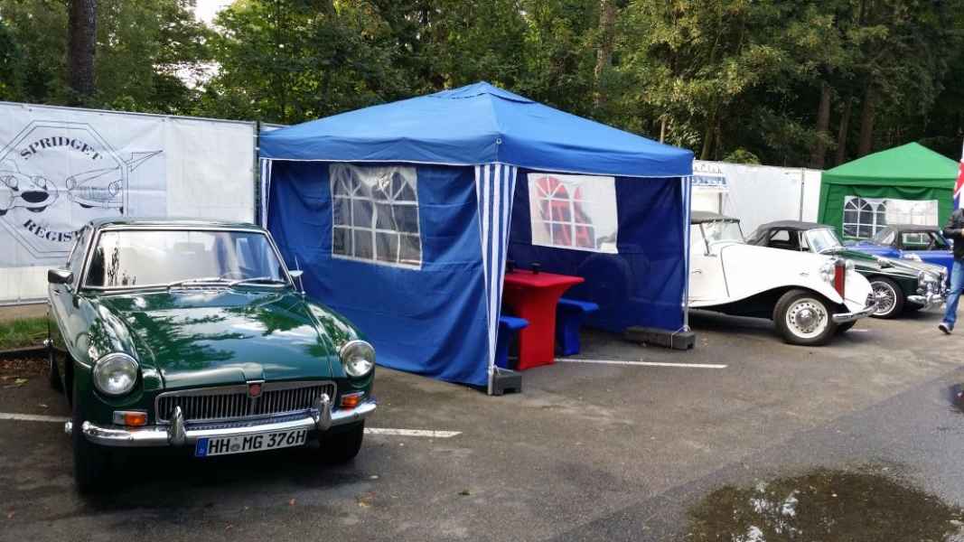 Auch beim 14. Hamburger Stadtparkrevival war der MGDC in Verbindung mit dem Spridgetregister vertreten. Auf der Saarlandstraße, der langen Gegengeraden waren wir in bester Gesellschaft mit den anderen englischen Clubs. Am Samstag war der Wettergott kein Oldtimerfreund und wir konnten zwischen Nieselregen, Regen und Starkregen wählen. Gerade dies war für die vielen Piloten mit ihren offenen Fahrzeugen sicherlich nicht ideal.