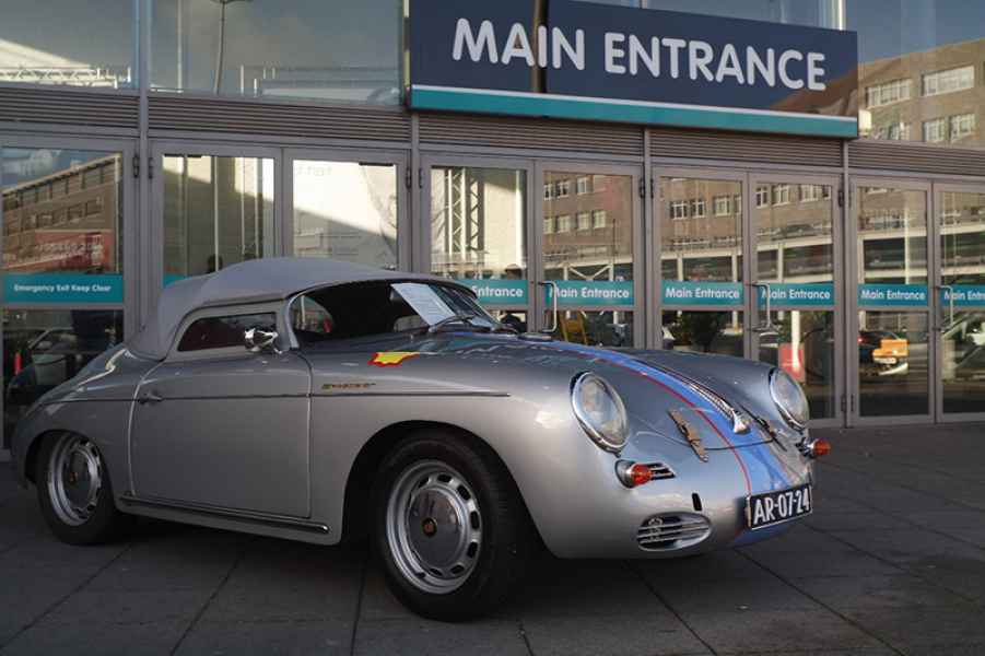 Also auch für unsere kleine Viererbande vom Engländer Stammtisch Aachen, wo wir es doch jetzt geschafft haben die Messe mal gemeinsam anzusteuern! Diesmal hatte ich mir fest vorgenommen, mich einfach nur, der Nase nach, durchs Angebot treiben zu lassen und den Emotionen freien Lauf zu lassen. Kein Alles-Gesehen-Haben-Müssen-Ehrgeiz. Und keine Autokatalog-Fotos, sondern nur Stimmung aufnehmen & einfangen. Dazu ist die Messe ein wahres Eldorado für Anregungen für die kommende Saison. Überall sind Bei-stell-Tische mit Flyern und Infomaterial von kleineren Veranstaltern der Umgebung aufge-stellt, wo man sich reichlich bedienen kann und sonst kaum die Nase dran bekommt @ unsere Benelux Oldtimerfreunde sind ziemlich rege, von Süd-Limbourg bis in die belgischen Ardennen kann man schon mal vorplanen. Bereits an der Messe-Pforte gab es den ersten, wenn auch nicht anglophilen Appetit auf Fahrzeugwechsel, in Form eines original alten Por-sche Speedsters im perfekten Gewand, und auch noch verkäuflich. Aber was die Dinger inzwischen kosten! 145T € waren aufgerufen!