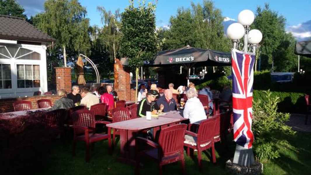 Begrüßung der 30 Teams gegen 19.00 Uhr im Biergarten des Hotel Ripken durch Werner mit seinem bewährten Team, fröhlicher Auftakt bei angemessenem Wetter.