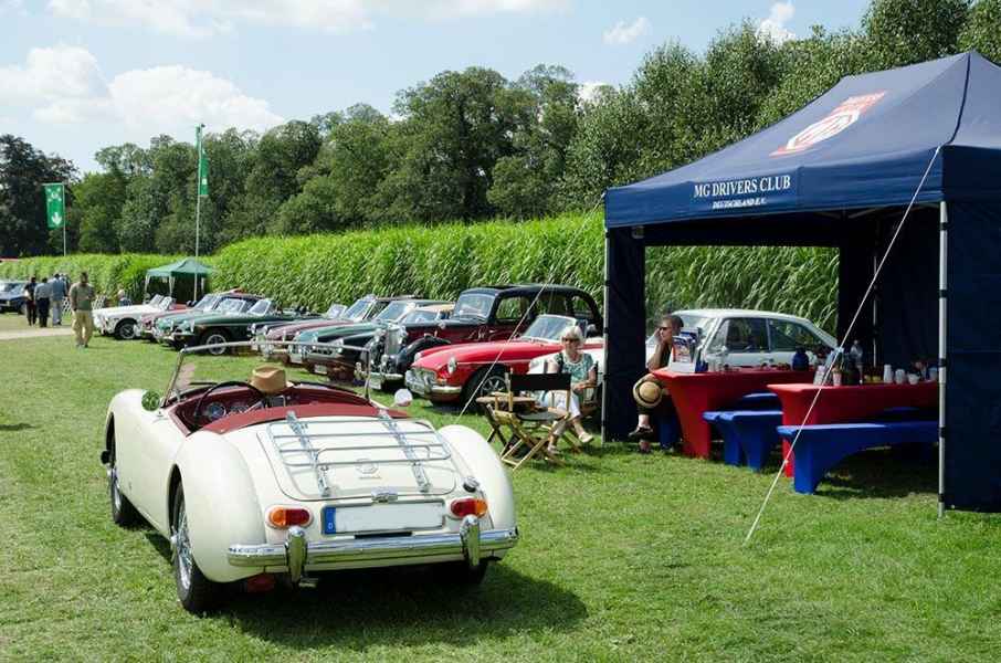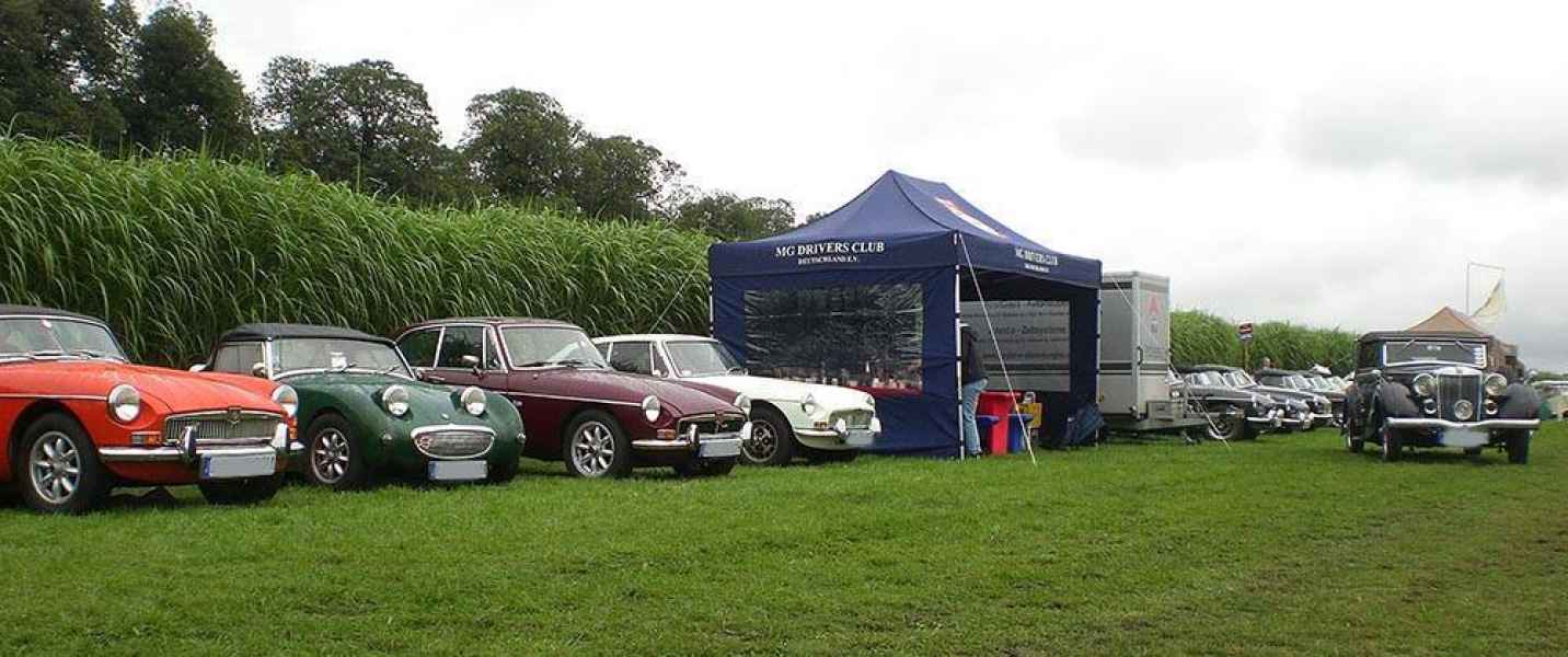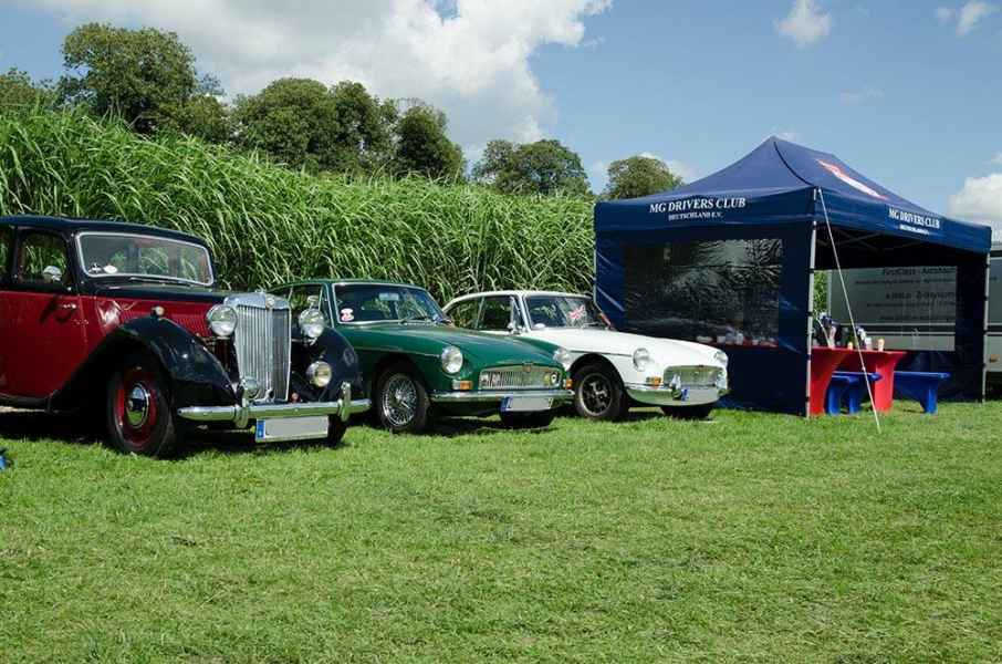 Der einzige gravierende Unterschied zu den Veranstaltungen der Vorjahre war am Samstag der bis zum Mittag andauernde Regen. Wer nun meint dass sich die MG Fahrer wegen des Wetters vom Besuch des Clubzeltes abhalten ließen, der sah sich getäuscht. Die Reihen der parkenden MGs waren alsbald gut gefüllt und ebenso das Zelt! Die mitgebrachten Picknicks wurden auf die Tische verteilt und die Stimmung war bestens.