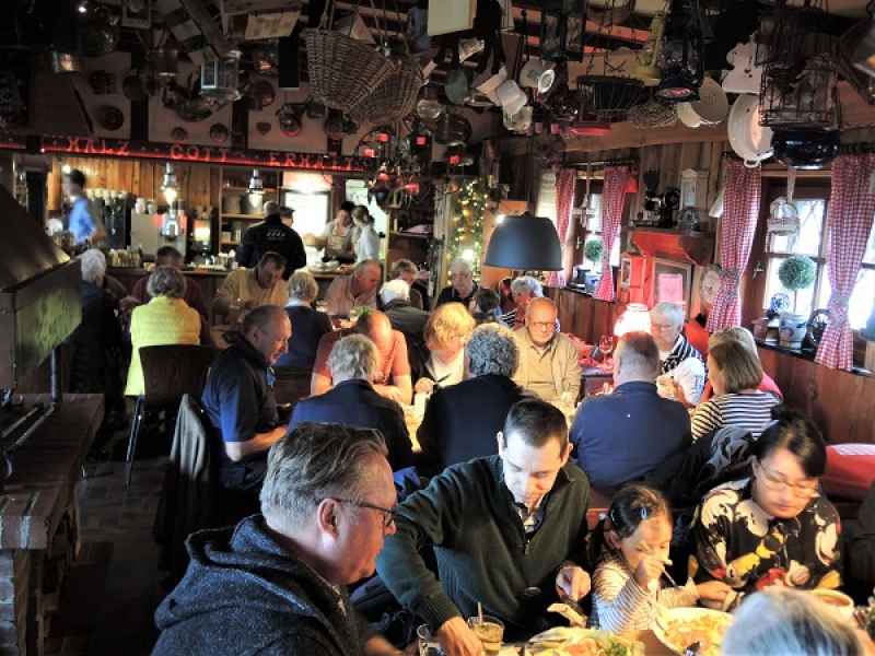 Über Nacht zog sich der Sommer zurück und der Herbst übernahm das Kommando. Also blieb das Verdeck erst einmal oben bei der entspannten Tour rollierend durchs Sauerland: Täler und Höhen mit traumhaften Aussichten, Wälder und Wiesen mit grasenden Kühen, gepflegte Dörfer mit reizvollen Fachwerkhäusern oder traditioneller Schieferverkleidung in Vollendung, Idylle pur! Dazu kleine Sträßchen, die den Wunsch „bitte jetzt kein Trecker“ sehr konkret werden ließen. Kirchen – eine sogar von innen – der Weitblick vom Bollerbergturm, ein Rückblick bis Pangäa, ausgelöst durch die Funde in der Korbacher Spalte und ein Quiz mit sehr überraschenden Fragen, bei deren Bearbeitung Hans mit Argusaugen darauf achtete, dass Mr. Google nicht hilfreich Auskunft geben konnte, füllten den Tag. Zwischenzeitlich gab´s große Teller gegen den kleinen Hunger und abends ein festliches Essen nach der „Siegerehrung“.