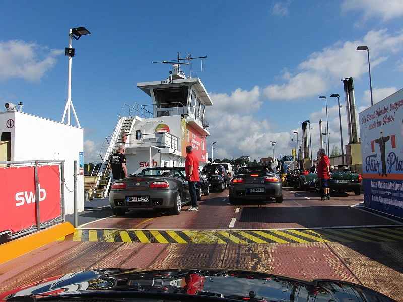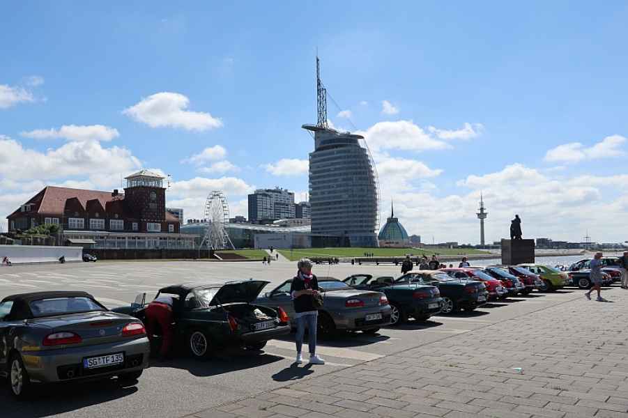 Auch diesmal wurden wir nicht enttäuscht. Nachdem wir die Unterlagen inclusive einer mehr als ausreichenden „Marschverpflegung“ in Empfang genommen und unsere Zimmer bezogen hatten, trafen wir uns im Biergarten zum italienischen Buffet und genossen das Zusammensein. Der Abend wurde nicht allzu lang, denn wir wollten früh starten. Pünktlich um dreiviertel Neun (8:45 Uhr für die Ungeübten) Waren alle auf dem Parkplatz und erhielten letzte Instruktionen. Auf sehr schönen Wegen und mithilfe einer Fähre kamen wir in Bremerhaven an und konnten unsere Autos Dank einer Sondergenehmigung auf dem Willy-Brand-Platz in Reih und Glied aufstellen.